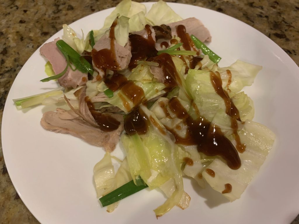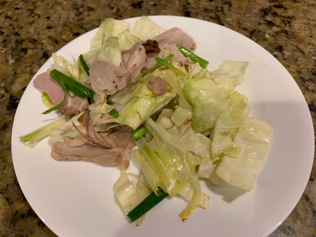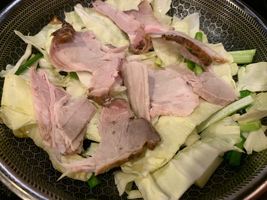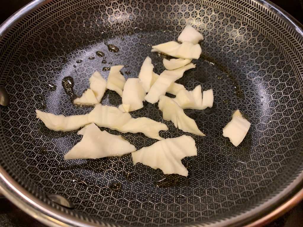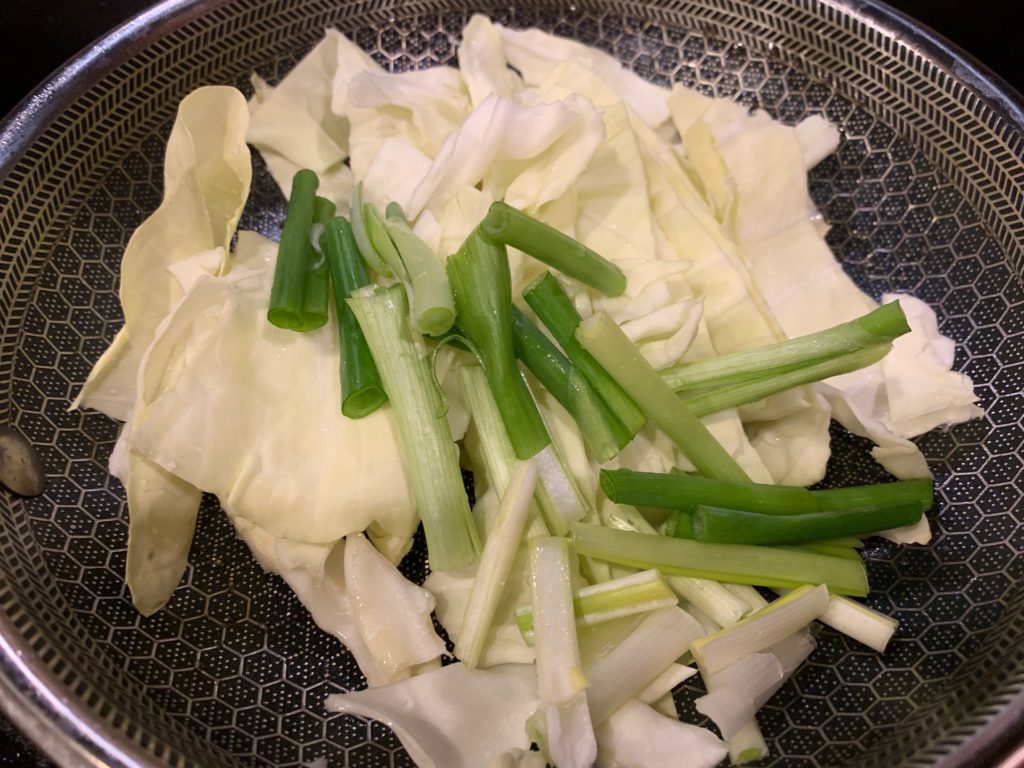 いやいやいや、それだと寂しいので、前もって同じフライパンで野菜とか炒めておいた。ゴマ油を敷いて、キャベツの芯の部分が先。
