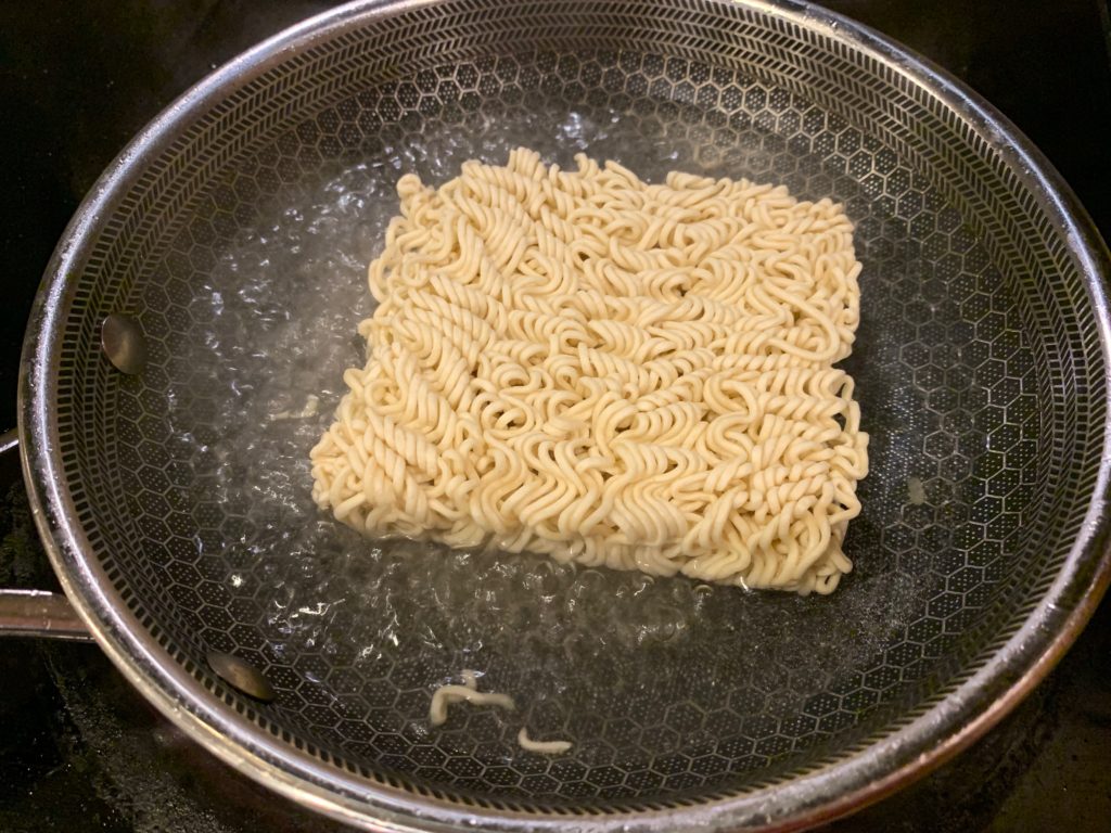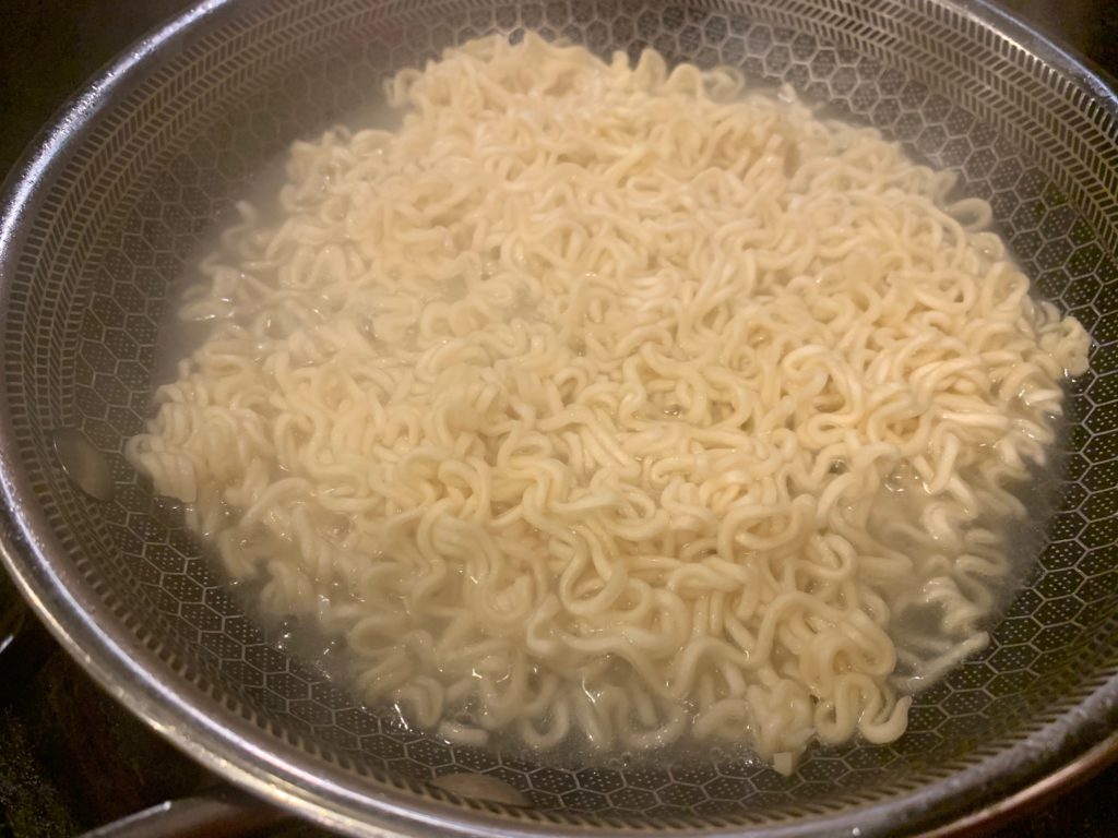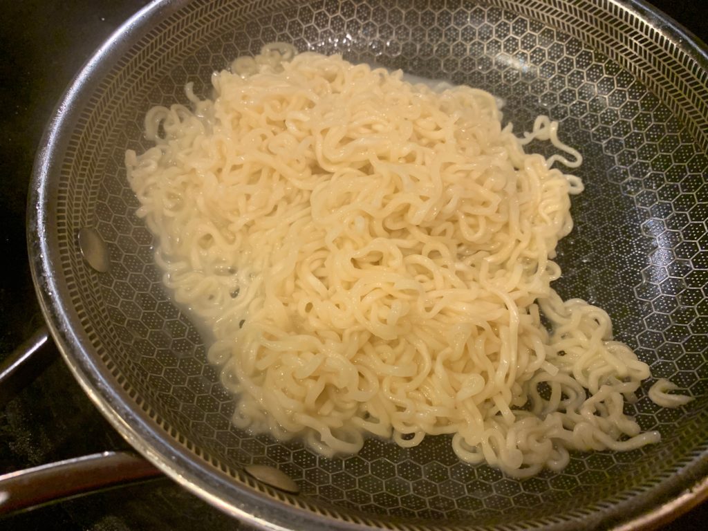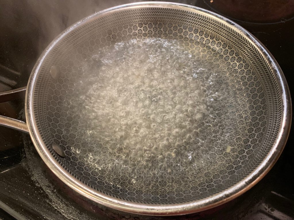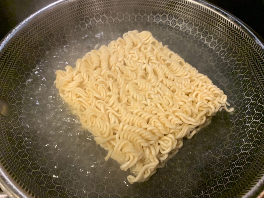 小さめのフライパンでお湯を250ml沸かす。出来上がりを見れば分かるけど、ちょっと水が多すぎた。普段はもちろん目分量だが、今日はこの記事を書くためにこだわりを捨てた代償は大きかっった。220mlをオススメしとく。