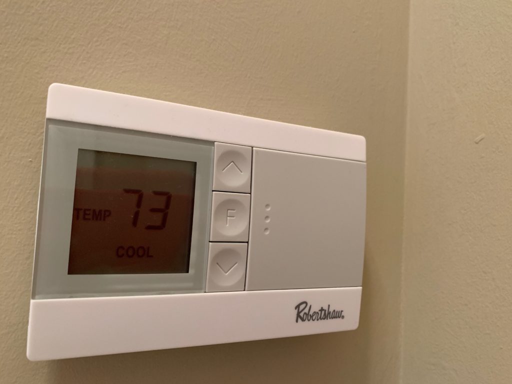 冷房が作動しない場合、設定温度を下げてみるとよい。上の写真だとCOOLというサインが出ていて、これは室内機のクーラーを作動させているという意味。サーモスタットによって表示の仕方は違うけど、何を作動させているかを示す。クーラーというのは室温よりも設定温度が低い時にONになる。これが作動してるかを確認。