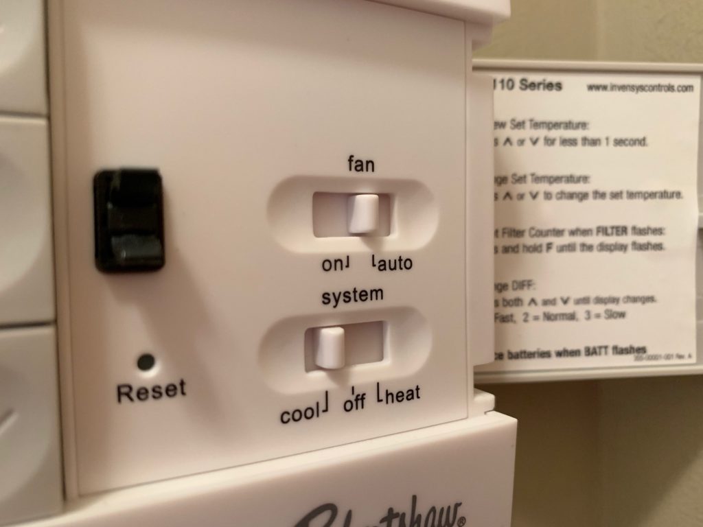 下がCOOL(冷房)とHEAT(暖房)の切り替えスイッチ。上はファンをいつ動かすか。AUTOにしておくと、冷暖房が作動した時、つまり室内機を作動させてCOOLかHEATで動作している時だけファンが回る。